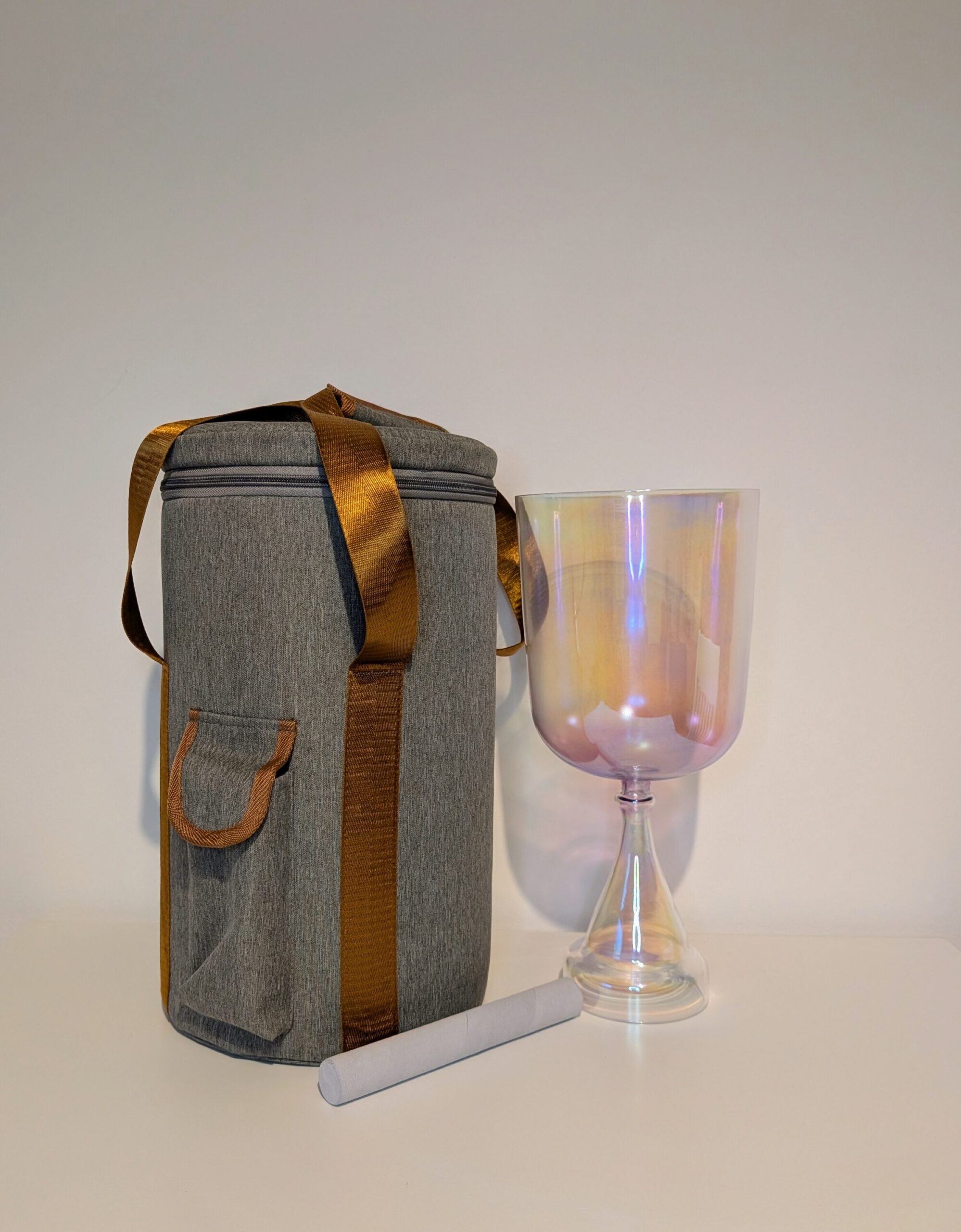 Der Mindblossom Grail wird inklusive Spezial Transporttasche und feinem Kunstlederschlägel geliefert. Für die Spieltechnik des weichen Bowings empfehle ich den rauen Kunstlederschlägel, für das Kreisen am Rand den feinen Silikonschlägel (Verlinkungen zu den Produkten).