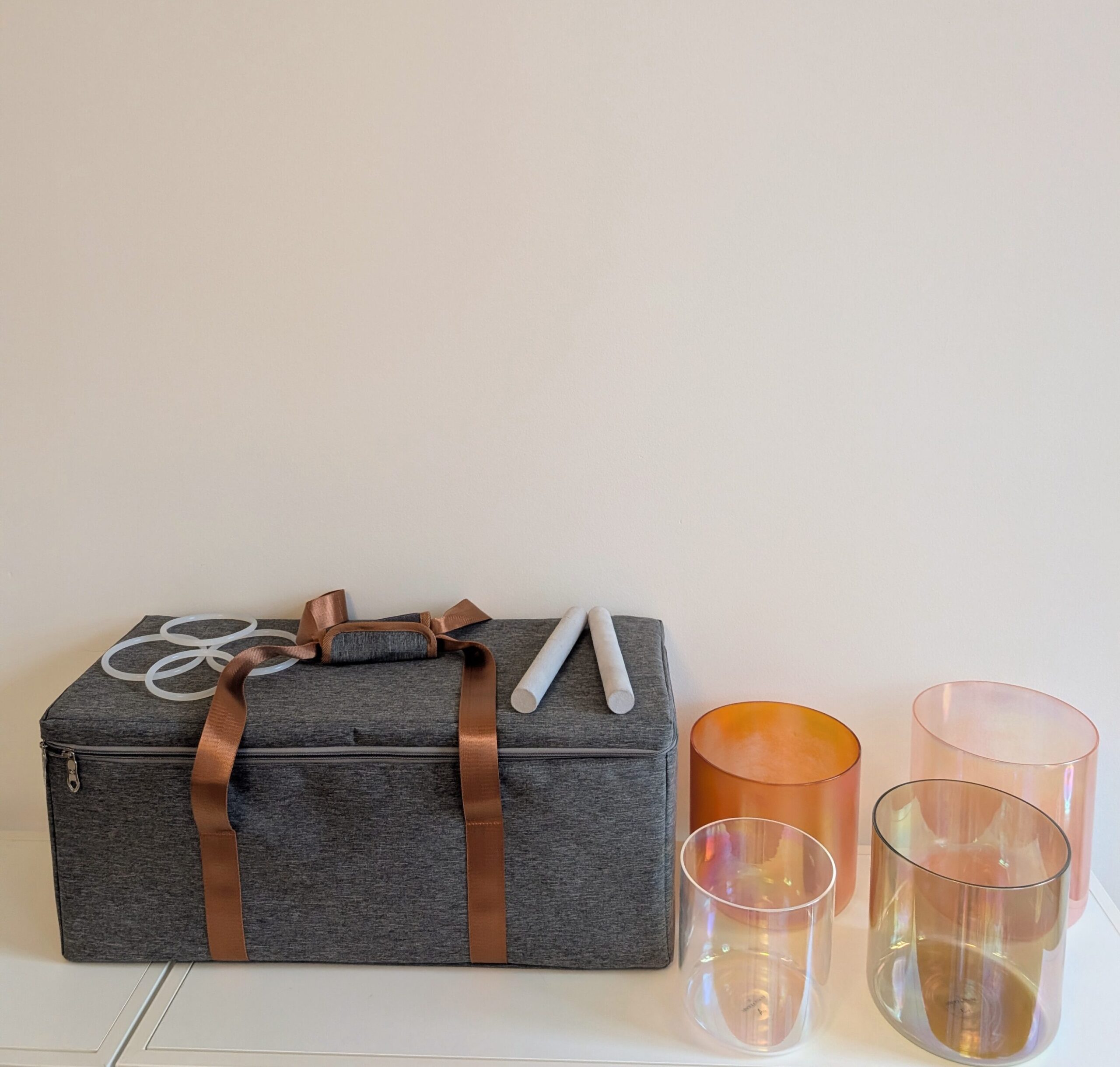 Das vierteilige Set „Golden Sunset“ wird inklusive Spezial Transporttasche, 4 Silikonringen und 2 Kunstlederschlägeln geliefert. Der auf dem Foto zu sehende kleine Produktionsfehler (kleiner oranger Strich auf der C#4 Bowl) wurde preislich bereits berücksichtigt.